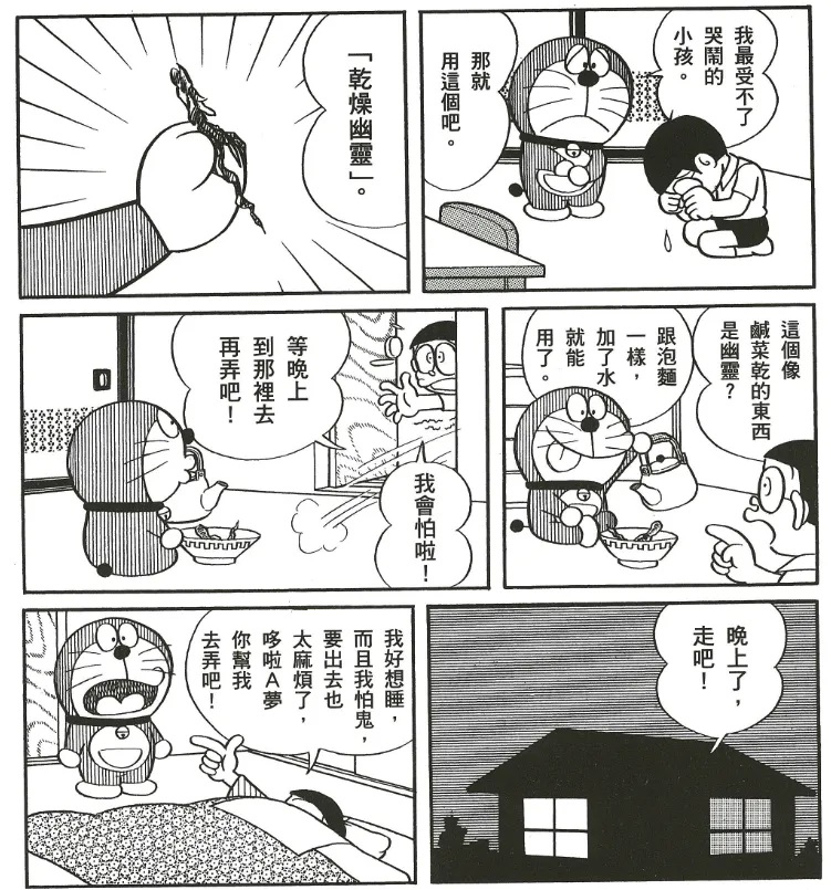 哆啦A梦拿出了道具“幽灵干”,这个道具一泡水就能变成“幽灵”,但是因为道具本身就有着很多缺陷,这个方法并没有奏效。故事的最后,大雄也因为这个并不光彩的想法而受到了惩罚。