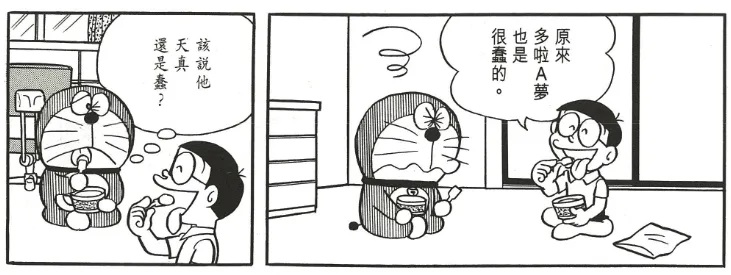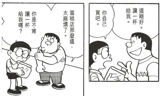 在单行本第9卷中,有一则名为《世间充满了谎言》的短篇故事,在这篇故事的开头,胖虎骗了大雄一份冰淇淋。