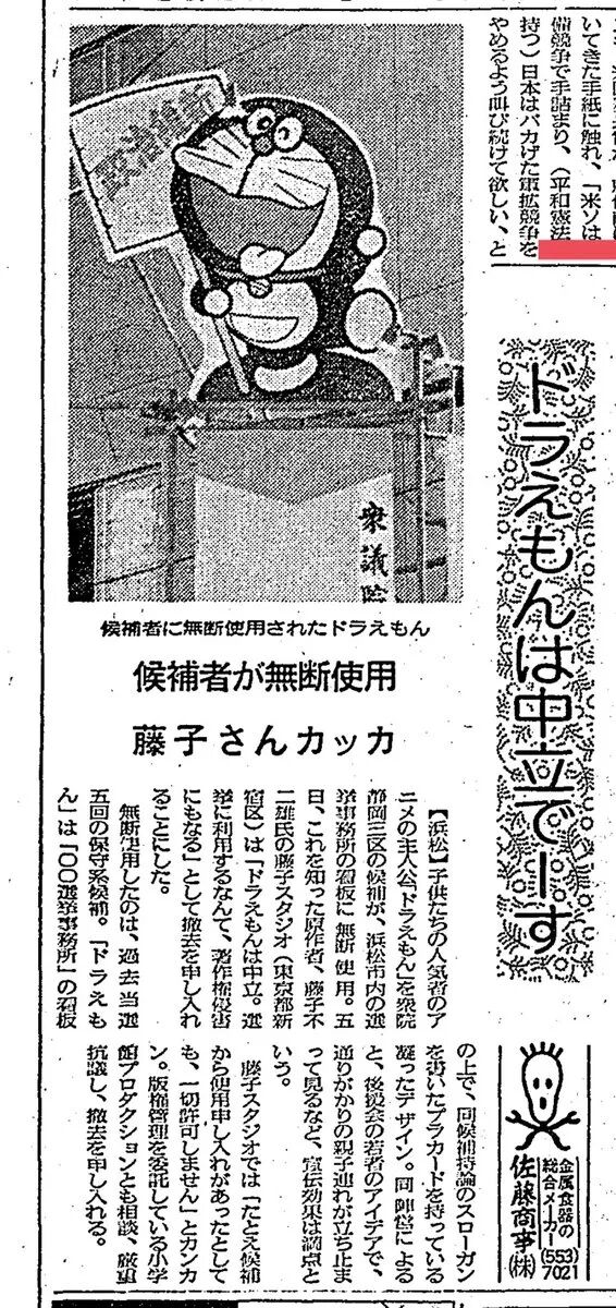 在《哆啦A梦》人气如日中天的时期,日本浜松市一个竞选办公室的门挂出了哆啦A梦的形象,而这个竞选办公室的目的也很明确,就是利用哆啦A梦“国民动漫”的“身份”为自己站台。得知此事的藤子·F·不二雄老师非常生气,于是就以藤子工作室的名义提出严正的抗议,同时还在报纸上刊登了声明。