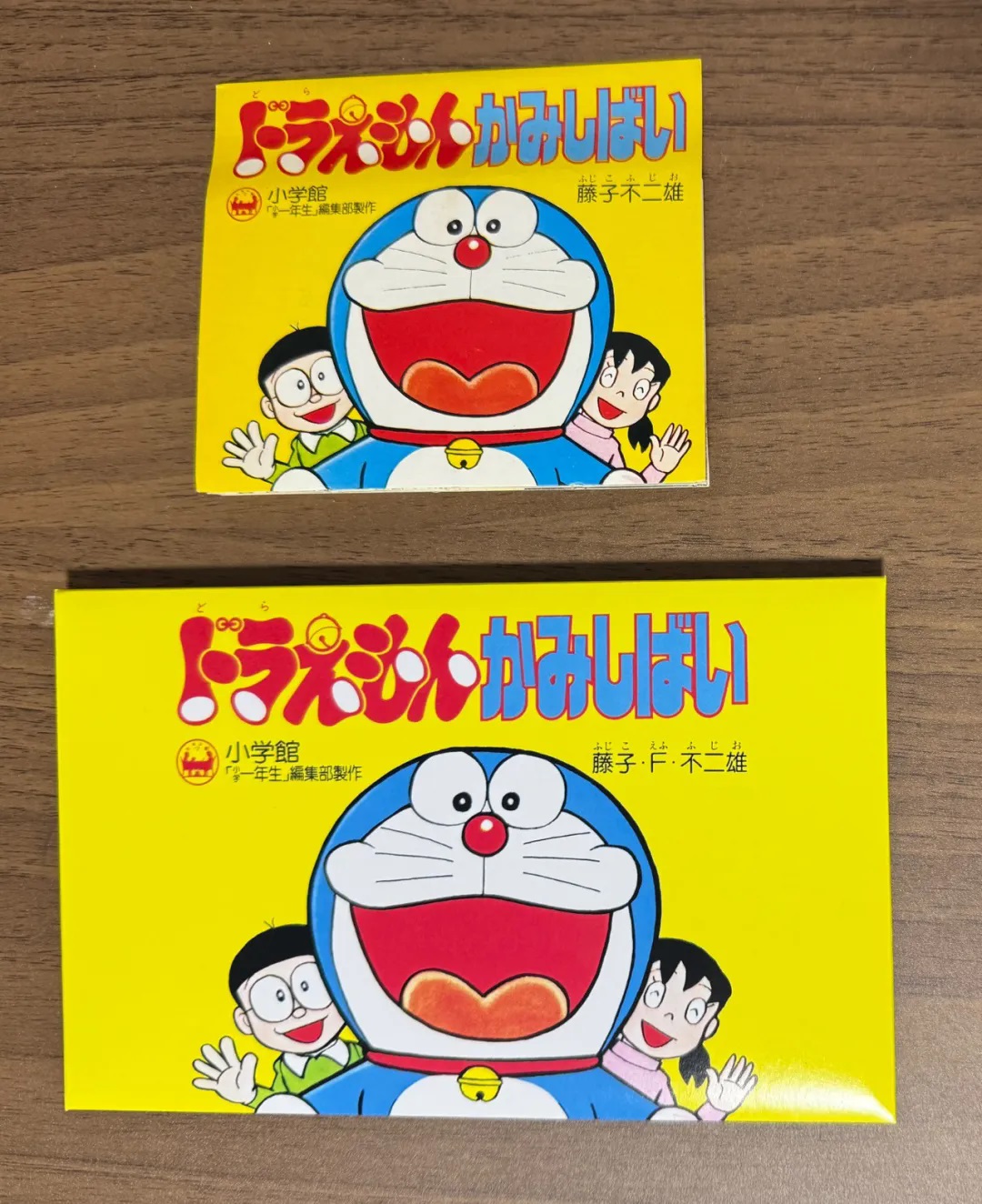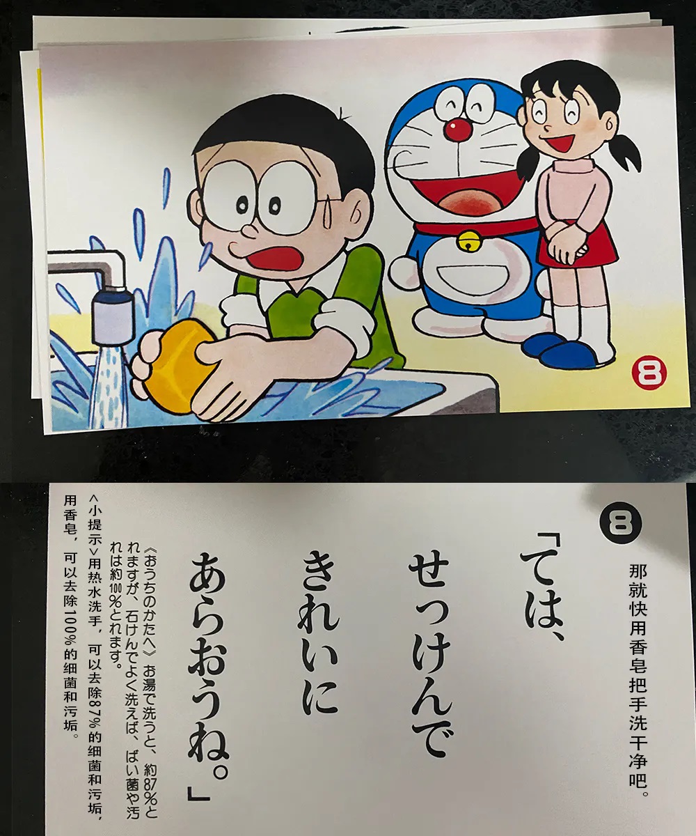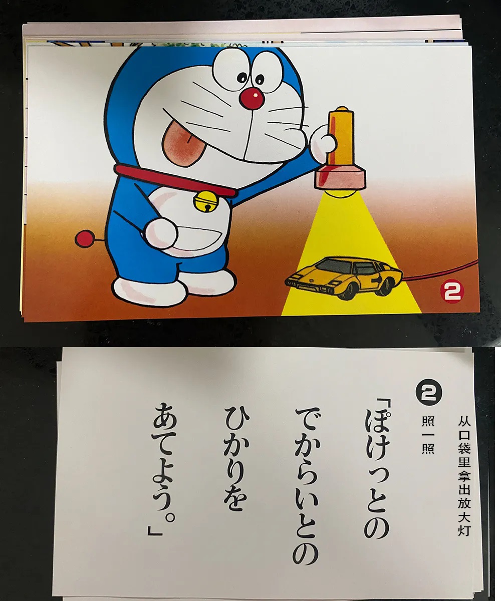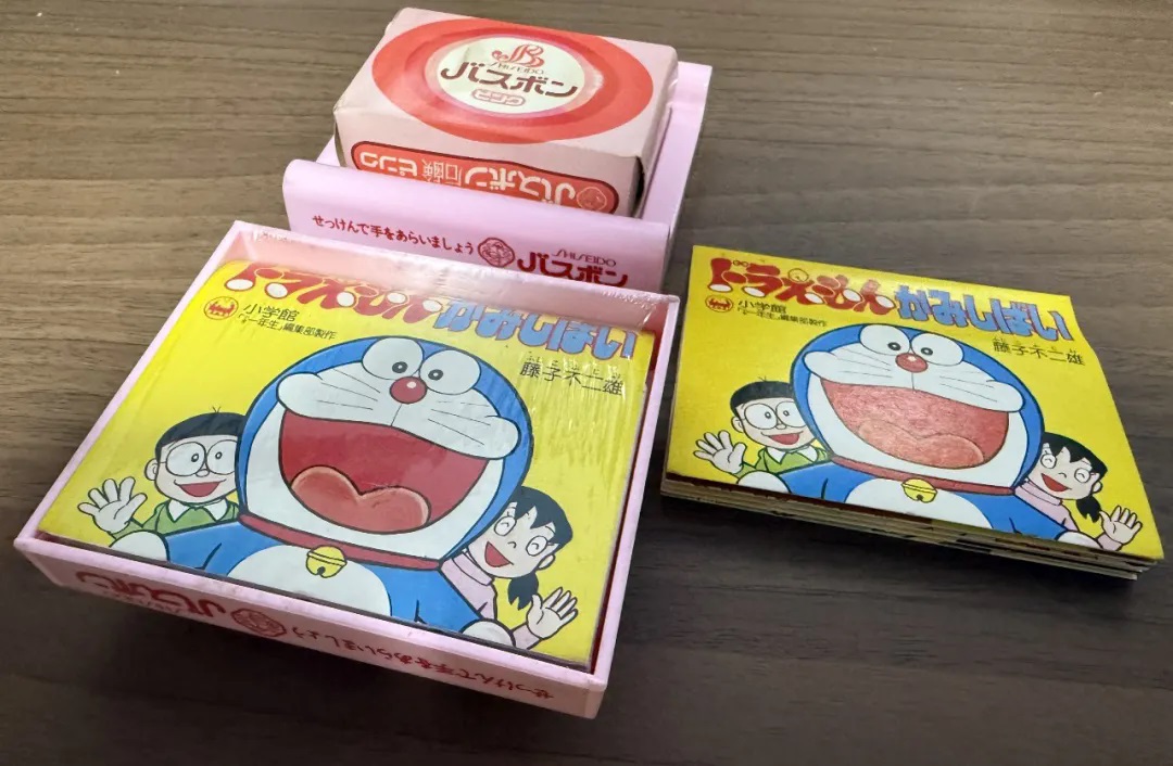 这个“哆啦A梦纸芝居”推测是在1978年初由小学馆举办的“庆祝新生入学大会”上的所分发的纪念品,该赠品是与资生堂的香皂联名。在原版纪念品中,可以与香皂盒配合使用,从正面看到图案,在背面可以看到与图案相对应的对话。