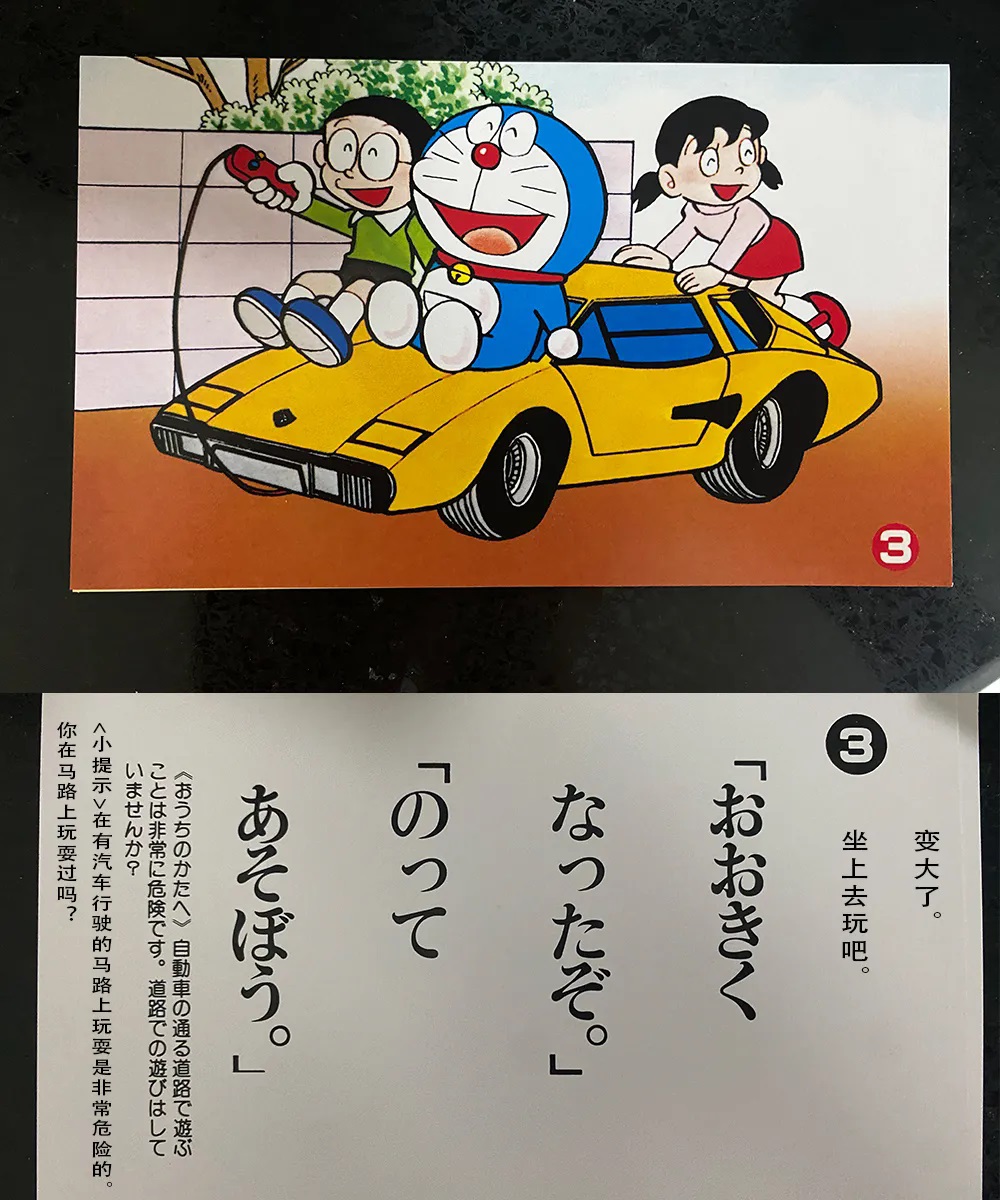 值得一提的是,这个故事中出现的跑车是兰博基尼康塔奇,藤子·F·不二雄老师似乎很喜欢这款跑车,这款跑车在《哆啦A梦》漫画中出现了不止一次。另外,也可以看出,这个故事篇幅虽短,但是很完整,而且因为是针对刚入学的儿童,所以在旁边也加了很多小提示,寓教于乐。
