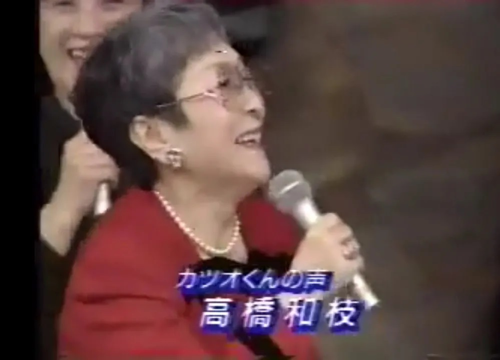 在1980年播出的特别版动画《哆啦A梦惊奇全百科》中,为黄色哆啦A梦配音的是高桥和枝。高桥和枝也是日本老资格的配音演员,她配音过的知名角色包括《海螺小姐》中的矶野胜男,巧合的是,高桥和枝是于1969年12月开始成为矶野胜男第二代配音演员,而在她之前为矶野胜男配音的正是大山羡代。高桥和枝于1999年去世,享年70岁。