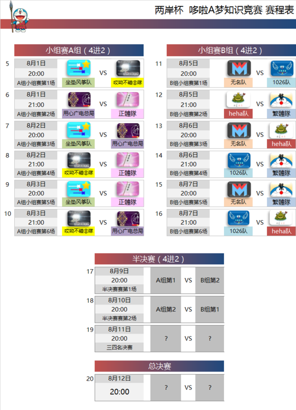 对于出题组,我相信大家在寄刀片的时候心里肯定也是体谅出题组成员的。每一届比赛需要的题量都很大(见之后统计),即使是对于哆啦这样拥有丰富考点的作品,每个出题人都需要绞尽脑汁出每一题。对于其中哪些难度很高的题目,虽然难度的确很高,但也都是花费了出题人很大心血的题目。另外本届比赛的题目难度其实下降不少,更亲民(见之后统计),且答案基本都附有解析。虽然一开始有些不严谨的题目出现,但之后出题组马上采取措施,每场比赛前重新复核题目,比赛时总有王子茂达等人候场随时应对突发争议。另本届题目由于细化了评分,题型、考点丰富,本身就很容易有争议出现。虽然本赛制到此为止,但只要有知识竞赛,出题组的工作将不会结束,且越往后越艰难。出题组也欢迎各位届时找相关负责人报名加入,领取丰富刀片 说了这么多,是时候引出本帖子的内容了。由于这个赛制的比赛已经全部结束,受王子的拜托,与王子一起汇集整理了各种相关资料,写成一个回顾贴。