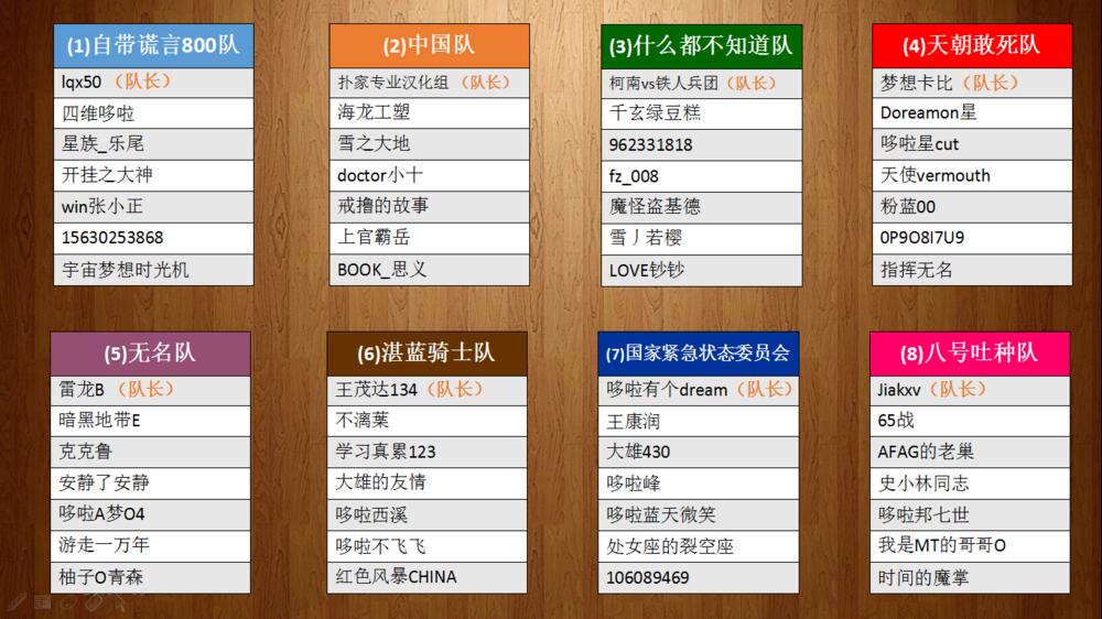 | 8 | 2015-8-8 | (胜)国家紧急状态委员会vs八号吐种队 | 26:23 | 幸福的铜锣烧/ 柯南VS铁人兵团 |