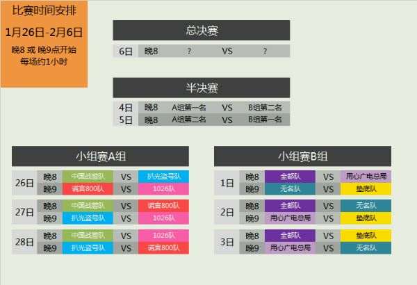| 12 | 2016-2-3 | (胜) 用心广电总局vs无名队 | 26:14 | ?/ 晓月冷寂→哆啦邦七世 |