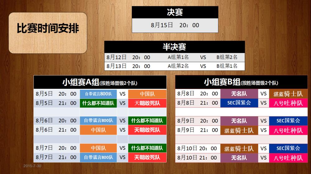 | 15 | 2015-8-15 | (胜)无名队vs湛蓝骑士队 | 26:24 | 小A在这里/ digidor |