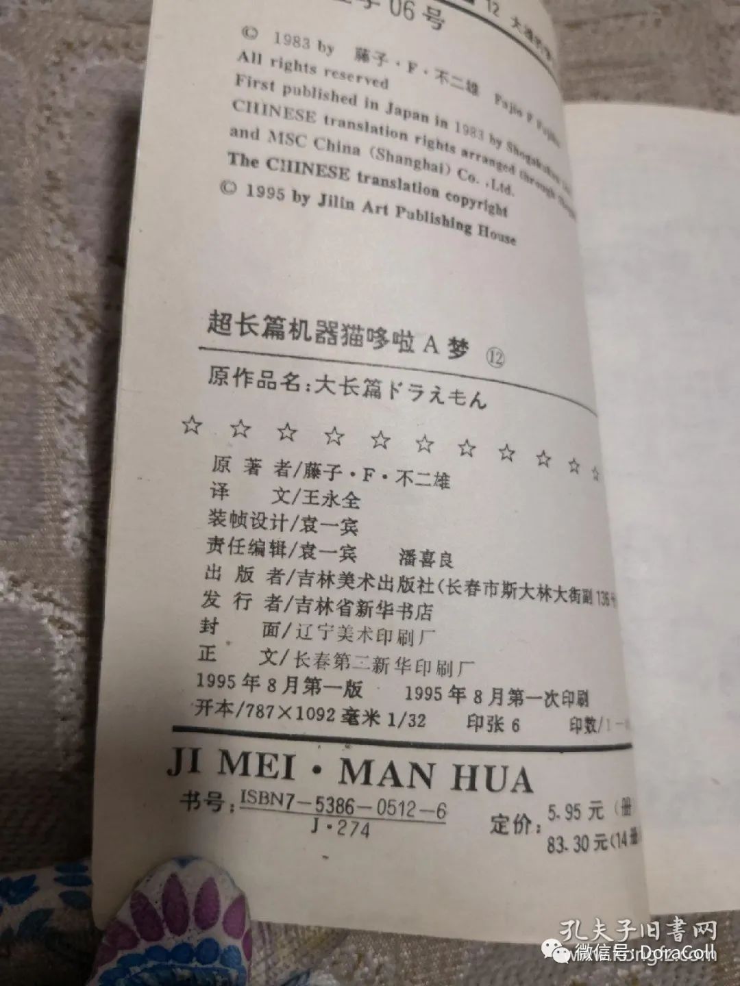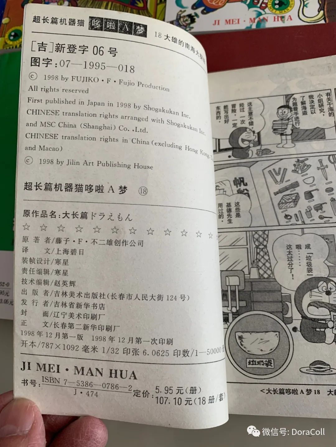 我手上超长篇也不是第一版,根据孔网的商品信息,吉美哆啦超长篇第一版是1995年出版的,第一版共14册,每册5.95元,共83.3元。这也好解释,95年9月超长篇《大雄的创世日记》才发行,所以95年的吉美第一版不包括这本。