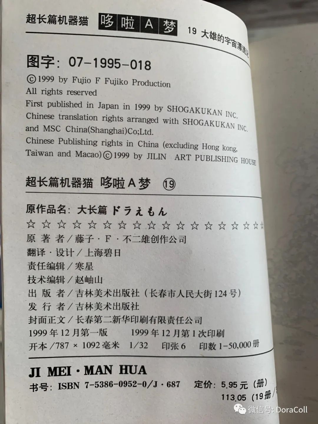 可以确定的是吉林美术出版社是在上世纪90年代中拿到小学馆《哆啦A梦》授权的,当时人民美术的《机器猫》43册单行刚刚出版两年,印了3版,印刷量很大。可能是这个原因,吉美首先出版的是超长篇哆啦A梦,我更习惯日文的称呼“大长篇”。