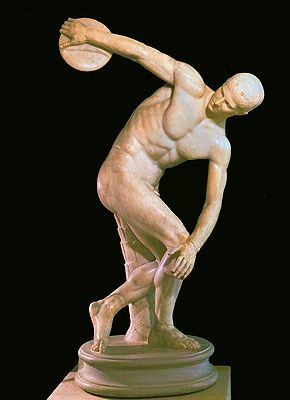 原作已佚,现为复制品。雕像选取运动员投掷铁饼过程中的瞬间动作,这正是铁饼出手前一系列瞬间万变动作中的暂时恒定状态,运动员右手握铁饼摆到最高点,全身重心落在右脚上,左脚趾反贴地面,膝部弯曲成钝角,整个形体有产生一种紧张的爆发力和弹力的感觉。形体造型是紧张的,然而在整体结构处理上,以及头部的表情上,却给人以沉着平稳的印象,这正是古典主义风格所追求的。