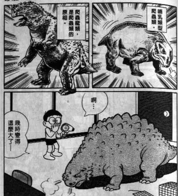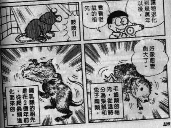 出自漫画短篇卷8的《进化退化放射光线》。大雄得到哆啦A梦的道具,用老鼠做实验,却没想到会变成这样= =。 这里很详细地提到了老鼠的进化过程0.0