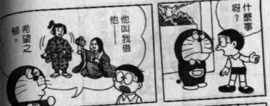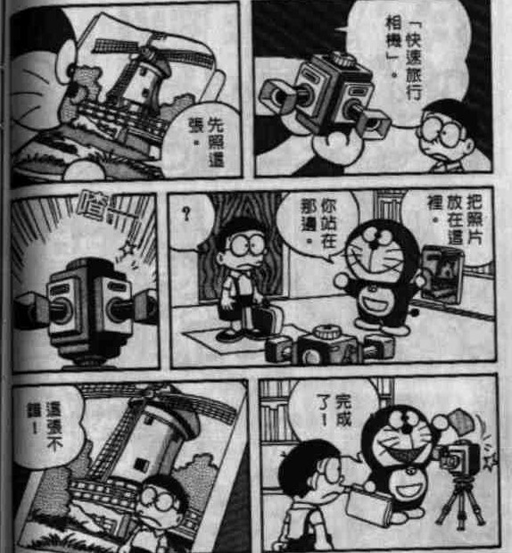 出自漫画短篇卷7的《没有去旅行的旅行照》。没想到早在四十多年前藤子老师已经设想过图片的合成,而这也在二十年后被发明出来了,也就是我们熟悉的PS软件。