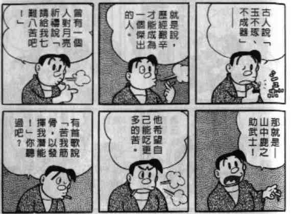 出自漫画短篇卷8的《辛苦酱》。大雄爸爸在教育大雄时,所列举的一个例子是山中路之助对着月亮起誓。更准确应该译为山中幸盛,也被译为山中鹿之介。