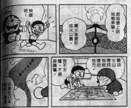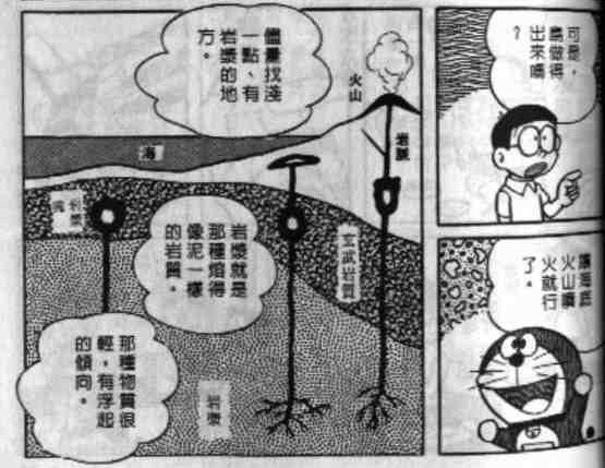 出自漫画短篇卷9的《建造无人岛》,大雄与哆啦A梦想要建造一个能在海边居住的土地,这里提到了火山的形成以及日本的部分火山带0.0