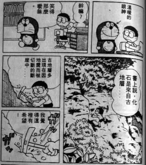 出自漫画短篇卷10的《大雄的恐龙》。大雄决心自己找到一枚恐龙蛋,这里提到了化石。