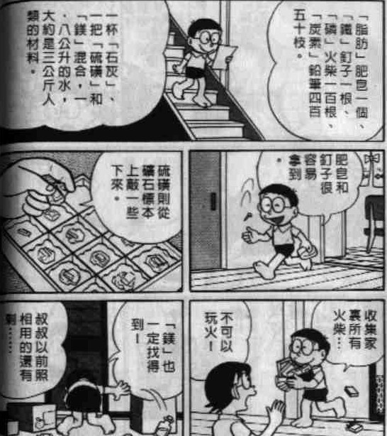 出自漫画短篇卷8的《人类制造机》。大雄看到房间里的人类制造机,通过说明书想要准备材料制造一个小孩子。这里提到了一个人体内所含有的化学成分。
