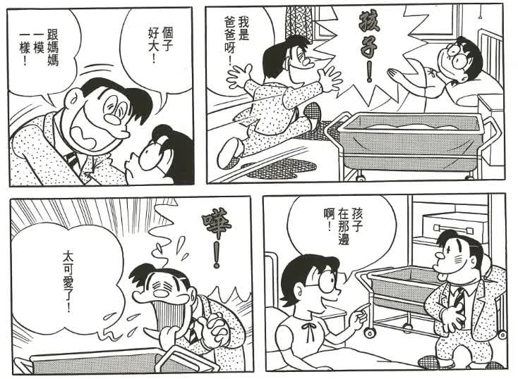 另外,大雄的爸爸——野比大助跑到了医院,因为太兴奋,错把玉子当成了刚出生的大雄,这段剧情也是取自于落语,名为《安产》。
