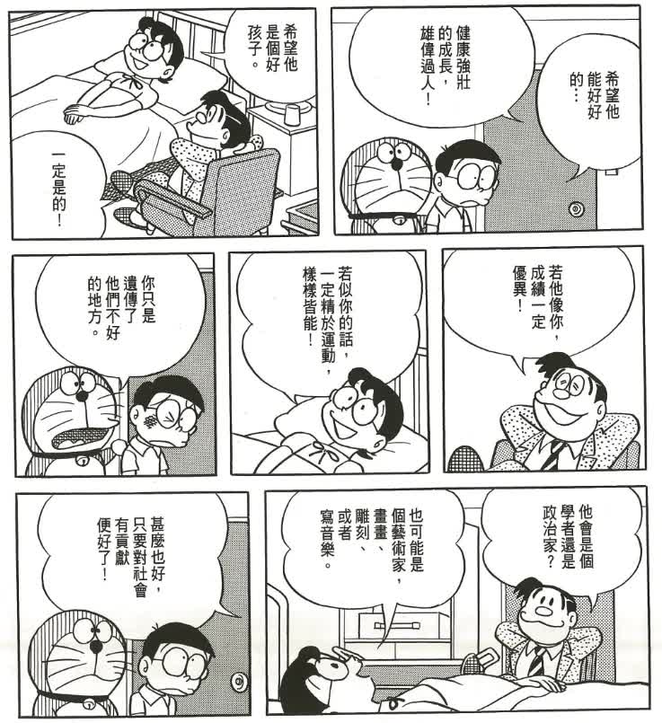 所以说,藤子·F·不二雄老师在8月份发表了这篇《我出生的那一天》,并将大雄的生日也设定在8月份,应该也包含了对自己女儿的爱。在故事中,藤子·F·不二雄老师将父母面对自己刚出生的孩子的喜悦之情也描写得淋漓尽致:野比大助和玉子为孩子起名字、展望未来,二人脸上洋溢幸福的笑容,即使只通过黑白的画面和文字,作为读者的我们,也能感受到这份为人父母幸福的喜悦。这个短篇中,大雄回到过去,见证了自己的出生,也从父母对自己未来的期望中,感受到了父母对自己的爱,而大雄父母说的那段话,不仅感动了大雄,也感动了很多读者,无论是大人还是孩子,都会从这些话中感受到温暖。而藤子·F·不二雄老师在创作这段剧情的时候,估计也回想起了自己女儿出生时的情景。