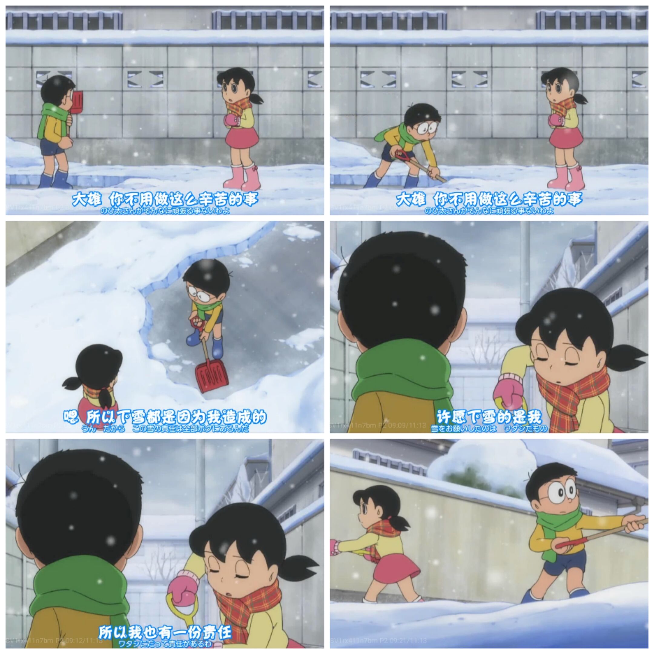 而静香在雪山看到的大雄,虽然一身毛病,但是他在很努力地做,大雄愿意为了对静香的情感而克服自己的弱点,努力地承担起自己应负的责任。