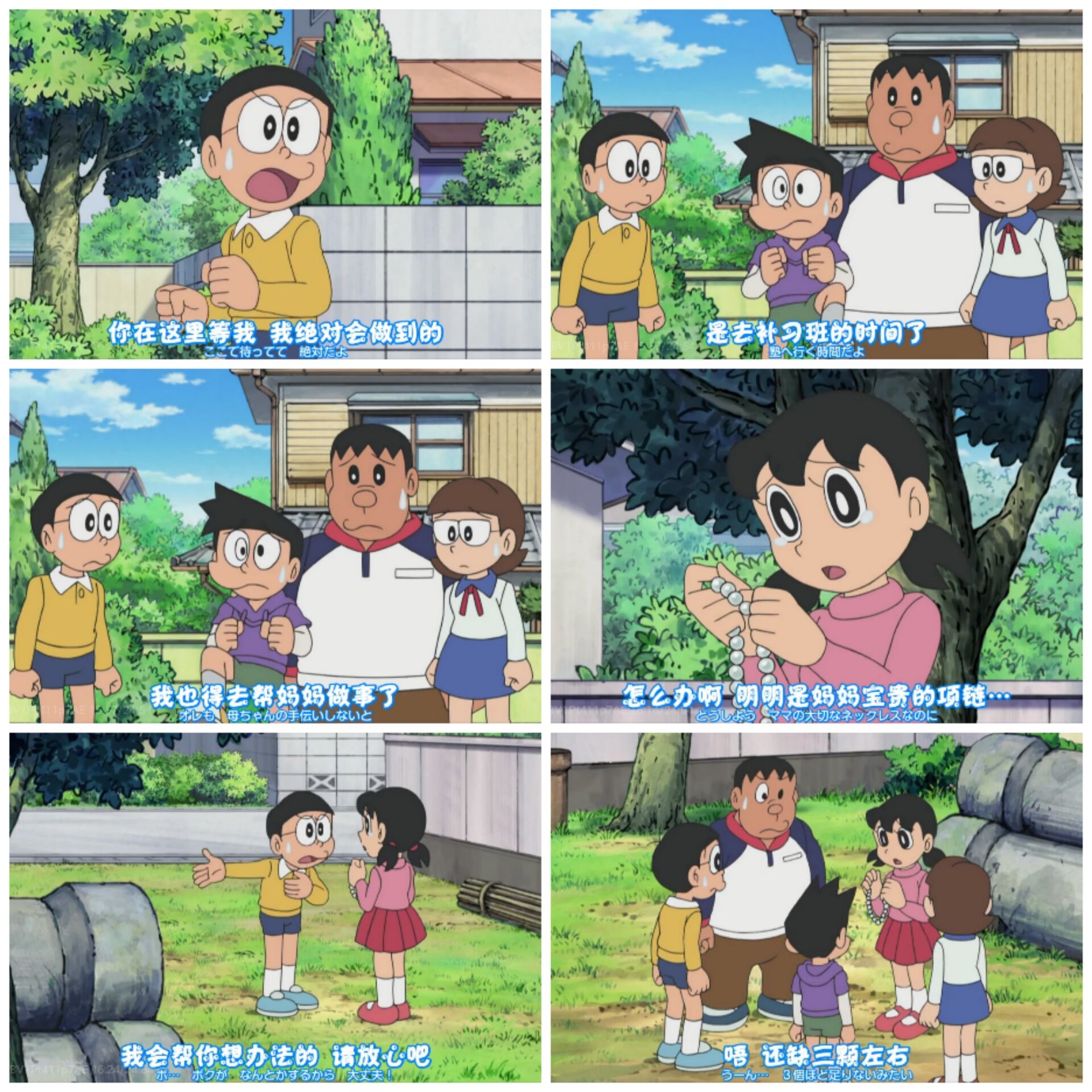 当胖虎和小夫弄丢了静香的项链却都不愿意承担责任的时候,大雄留下来帮助静香找失落的珍珠。