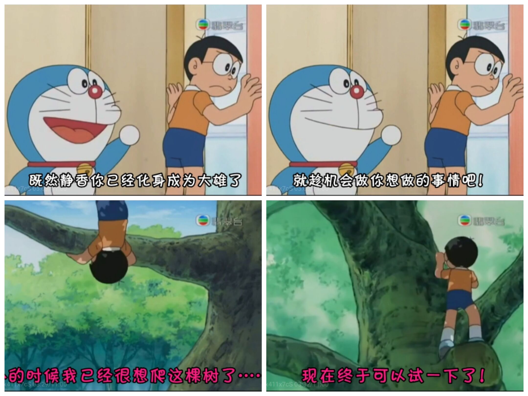 而在与大雄交换身体之后,静香用男孩子的身体完成了自己的小小梦想——爬上后山上的树,实际上大雄从来不会爬树;