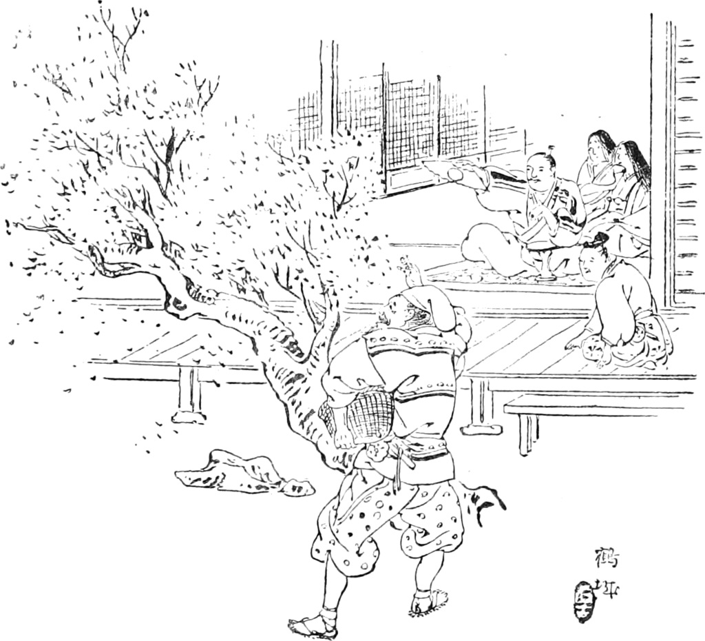 好心的夫妇将燃烧后的灰烬收集起来当做小狗的骨灰供奉。有一天晚上,好心的夫妇又梦见了小狗,在梦里,小狗告诉好心的夫妇,把这些灰烬撒在一棵枯萎的樱花树上。第二天,好心的夫妇就按照小狗的指示,把灰烬撒在了枯萎的樱花树上。让人没想到的是,这棵枯萎的樱花树居然复苏并开满了樱花。这一幕恰巧被一位经过这里的大名(古代日本的诸侯)看见,这位大名感叹世间居然会有如此奇事,于是就要赏赐这对好心的夫妇。而那对坏心眼的夫妇又要来抢夺剩下的灰烬,在抢夺过程中,这些灰烬迷了大名的眼睛,大名盛怒之下,下令将这对坏心眼的夫妇投入大牢。