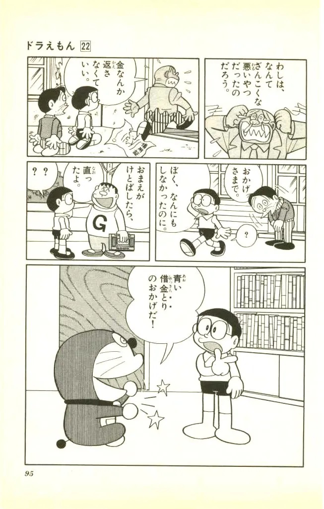 在漫画中,大雄原本是想帮助胖虎修好收音机,但是却遇到了一位借了高利贷的人,大雄看到这个人很可怜,于是就想帮助他,实际上,对于大雄来说,这就是一种分享。当大雄想尽办法要捉住一只鸟的时候,却阴差阳错的,把青漆喷到了讨债人的身上。但是也恰恰是这位讨债人,不但良心发现,免除了借债人的债务,还误打误撞修好了胖虎的收音机。其实这里也是一个谐音梗,在日语里,讨债人或者讨债公司(借金取り)的后半部与“鸟”字发音相同,所以这位讨债人也被看成是“青鸟”了。