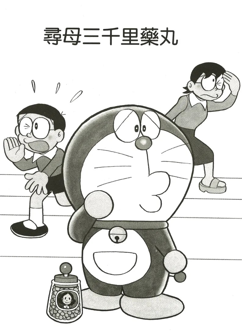 在单行本第21卷中有一则短篇故事,名为《寻母三千公里药丸》,这个故事讲述的是,大雄因为忍受不了妈妈的管教,想避开妈妈,于是哆啦A梦拿出道具“寻母三千公里药丸”,这个药丸只要吃下一粒就必须要300米才能见到妈妈。结果大雄吃了1万粒,这样就必须走3000公里,才能见到妈妈,最后,哆啦A梦利用道具“任意门”,才让大雄成功见到了妈妈……