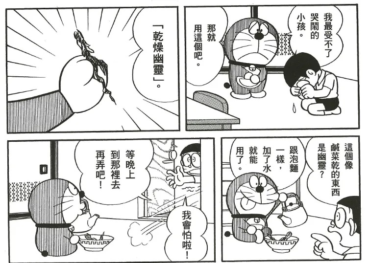 哆啦A梦拿出了道具“幽灵干”,这个道具一泡水就能变成“幽灵”,但是因为道具本身就有着很多缺陷,这个方法并没有奏效。故事的最后,大雄也因为这个并不光彩的想法而受到了惩罚。