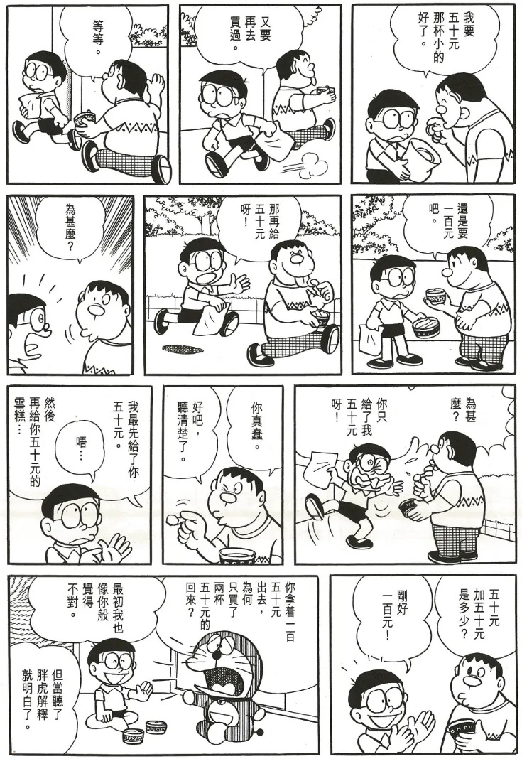 在单行本第9卷中,有一则名为《世间充满了谎言》的短篇故事,在这篇故事的开头,胖虎骗了大雄一份冰淇淋。