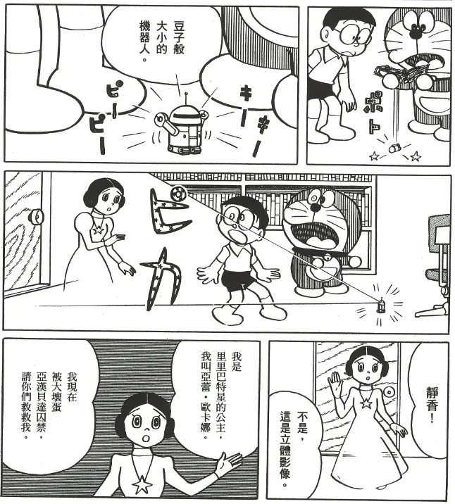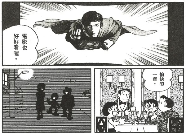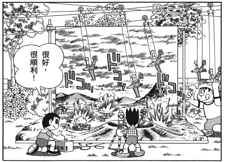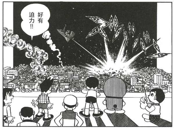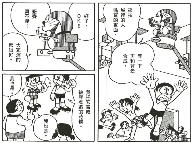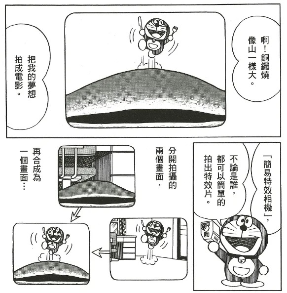 到了《超大作特摄电影“宇宙大魔神”》(单行本第20卷)这个故事中,藤子·F·不二雄老师就让大雄和他的小伙伴们真的制作了一部电影。在这个短篇里,哆啦A梦拿出了一台摄像机,这台摄像机可以将两个拍摄的画面进行合成,从而制作出让人意想不到的影像,其实这台摄像机的原理与早期电影拍摄中的二次曝光是非常类似的,在早期没有计算机图像技术(CGI)的年代,很多大师,比如乔治·梅里埃就利用胶片的多次曝光技术,制造出了让人叹为观止的影像效果。