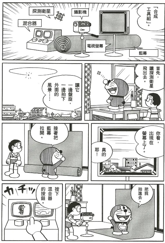 在《用合成技术创造大雄超人》(单行本第30卷)这个故事中,藤子·F·不二雄老师则向我们完整的展示了电影合成的原理,在这个故事中,哆啦A梦拿出来了一个名为“合成画面装置”的道具,这个道具可以让将拍摄的画面投射在现实环境中。虽然这个道具在功能上略显夸张,但是它已经基本上完整、准确的展现了电影特效制作的技术流程,这里也不得不佩服藤子·F·不二雄老师对于电影制作的了解程度。