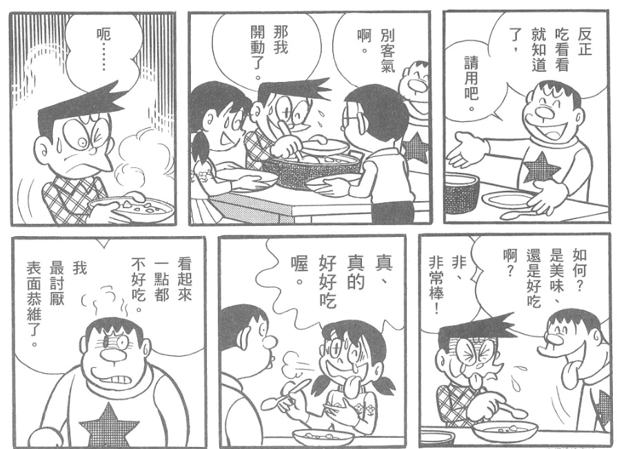 虽然战争结束的时候,藤子·F·不二雄老师还是个学生,但是对于当时社会的状况,他多少也是有所了解的,也许藤子·F·不二雄老师让胖虎做这道“胖虎炖菜”,也是为了让大家“忆苦思甜”吧……