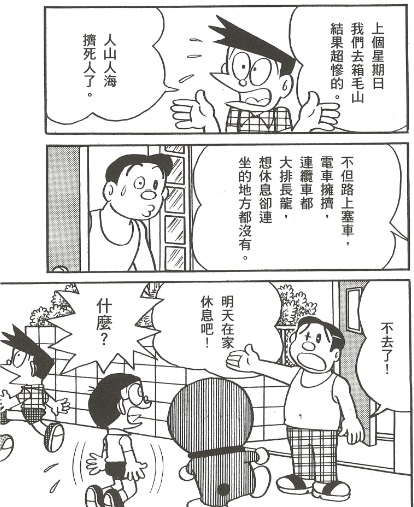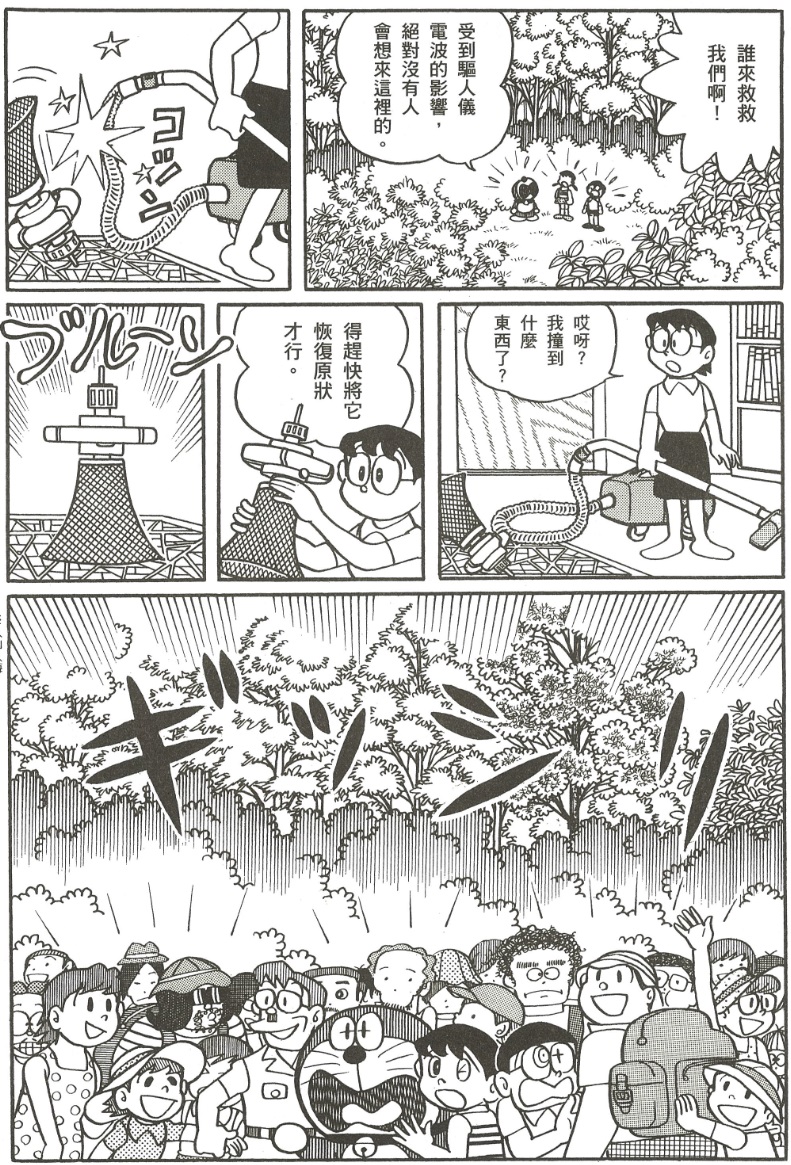 这个故事说的是,大雄一家本来要去箱毛山郊游,但是大雄的爸爸听小夫说箱毛山人很多,就打消了这个念头。失望的大雄在家里大哭大闹。于是,哆啦A梦就拿出了道具“驱赶陀螺仪”,把箱毛山的游客都赶跑了。由于整个山上一个人都没有,所以大雄他们就被困在了山上。最后还是大雄的妈妈“力挽狂澜”,解救了大雄。