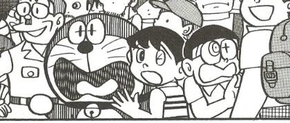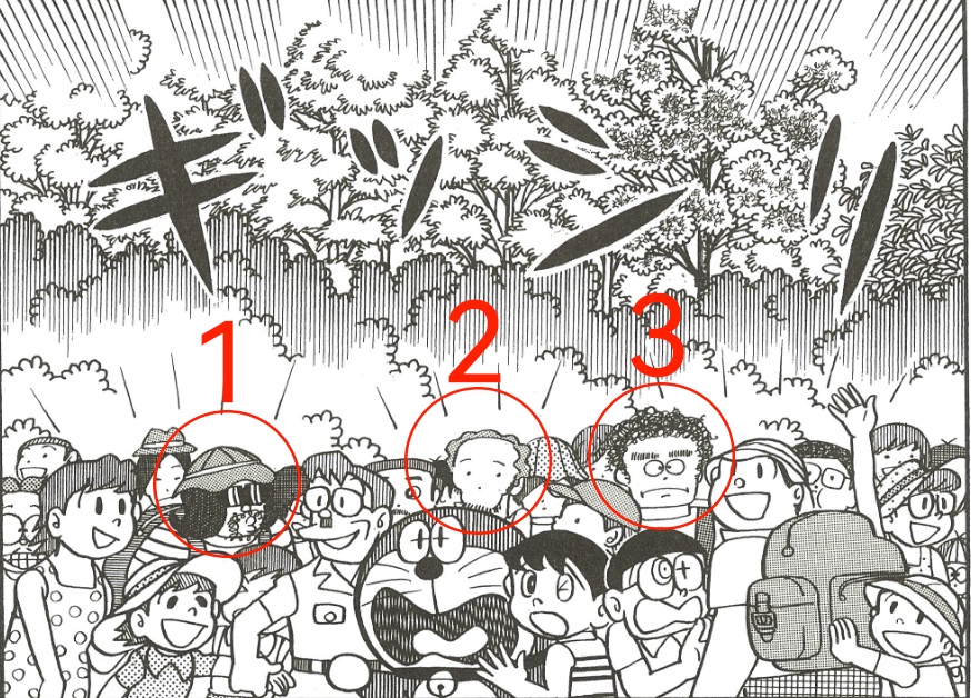 不知道朋友们有没有注意到一个细节:那就是在故事的最后,人群当中,有三个人明显与其它人格格不入,画风也与藤子·F·不二雄老师的人物不同。