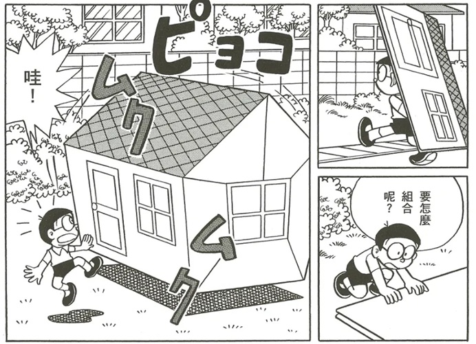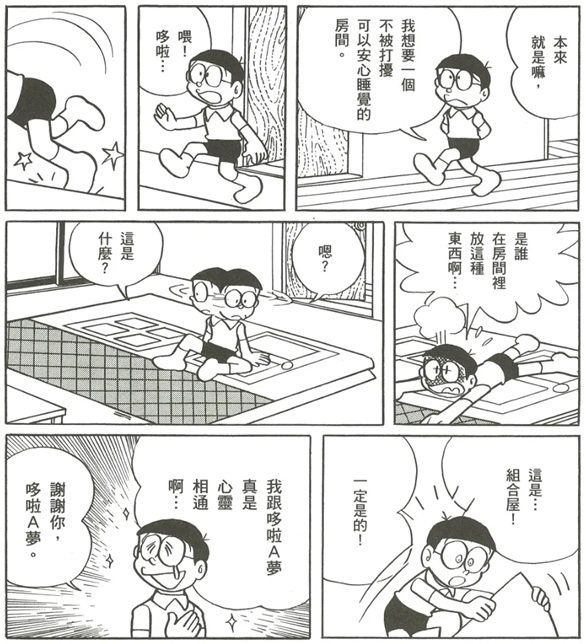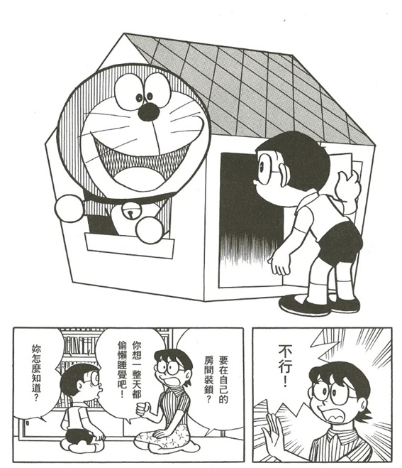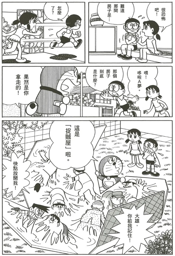 单行本第14卷中,有一则名为《吃人的房子》的短篇故事,这篇故事说的是大雄想要在自己的房间上锁,以便能不受打扰地睡午觉。被妈妈拒绝后,大雄回到房间发现了一个折叠房子,大雄以为是哆啦A梦和他心意相通,非常感动,于是就是将折叠屋拿到空地上组装起来。兴奋的大雄想邀请静香来玩,静香表示有点像自己看过的一部恐怖电影,一栋房子能把人吃掉。害怕的大雄连忙去找哆啦A梦问个明白,原来这个折叠屋是用来抓小偷的。