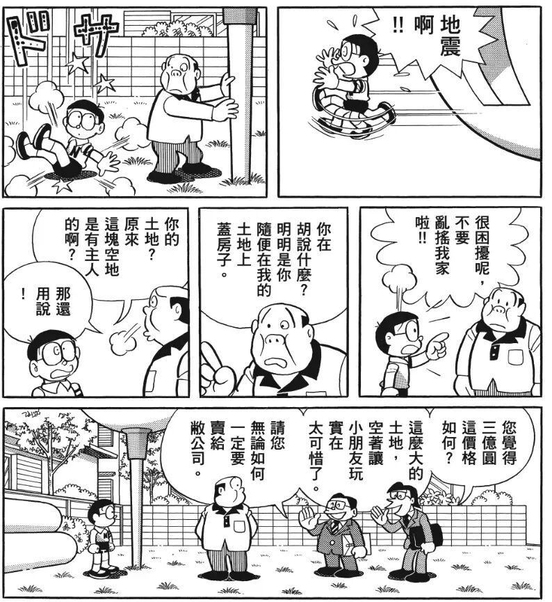 在大长篇《大雄的日本诞生》中,提到大雄他们经常玩耍的空地价值3亿日元。《大雄的日本诞生》开始连载于1988年,当时正是日本房价最疯狂的时候,当时练马区的平均地价每坪超过了300万日元。从漫画中的地图来看,空地的面积很大,差不多相当于四个普通一户建了,也就是说超了100坪,所以如果空地的主人真的以3亿的价格出手,感觉还有点赔,还有能往上涨价的空间。如果以这个价格来计算,大雄家的房子至少也得9000万日元以上……大雄家想买下来就更难了。