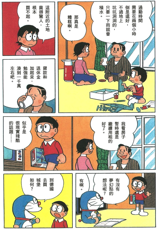这篇故事发表于1976年,根据相关资料显示,1976年,日本练马区的平均地价在每坪在46~50万日元左右,一坪大约等于3.3平方米,日本一户建,一搬占地面积在30坪到40坪左右,所以1976年练马区的平均房价应该在2000万日元左右,这已经远远超过大雄家所能承受的价格了,所以大雄爸爸就说,还是继续租房子住吧,小时候看到这个故事的时候还没有什么感觉,等到长大之后,再看到大雄爸爸说出这番话时的笑容,总能体会到另一番滋味……