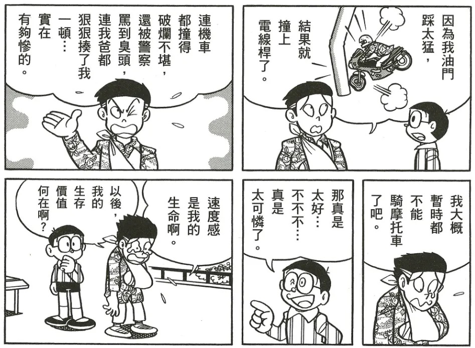另外在《哆啦A梦PLUS》第3卷的《速度感眼镜》这个故事中,出现了一位飙车少年,从画风上来看,应该也不是藤子·F·不二雄老师的手笔,推测也是由助手所画。
