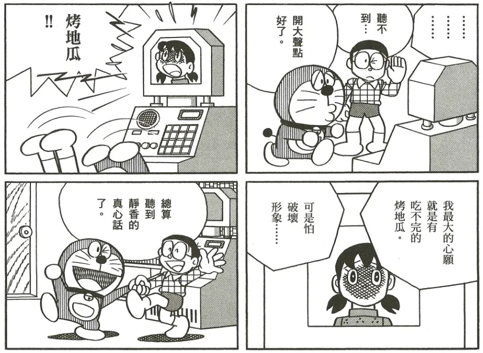 在单行本第28卷《静香心中的秘密》这个故事中,静香的生日快到了,大雄正为送静香什么礼物一事而发愁,于是就救助哆啦A梦,哆啦A梦拿出了一个道具,可以问出静香最喜欢什么东西,然后大雄可以根据答案选择送什么礼物。通过这个道具,大雄得知,静香最喜欢吃烤地瓜,但是又担心会破坏形象。大雄和哆啦A梦连忙种了大量的地瓜送给静香,结果却让静香非常生气。