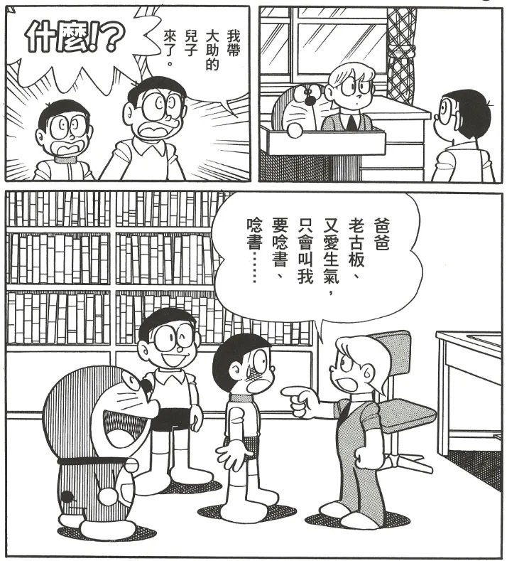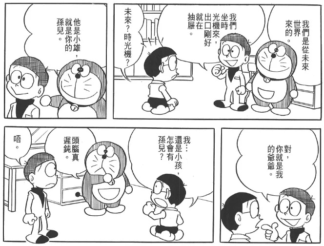 在单行本第36卷《大雄的儿子离家出走》这个故事,大雄的孙子也出场了。