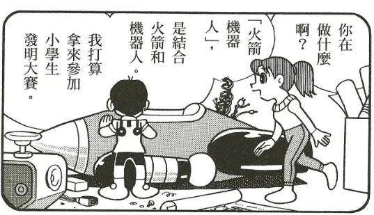 《前进!火箭人》是藤子·F·不二雄老师的早期作品。在单行本第40卷《让静香回心转意》这个故事中,大雄通过未来电视看到出木杉的儿子正在制作一个火箭,这个火箭的外形就是《前进!火箭人》中的火箭人。