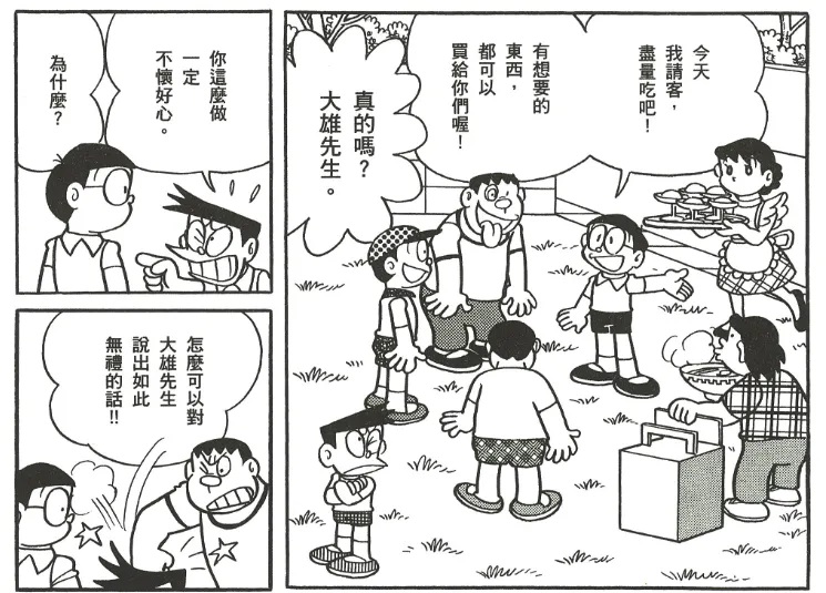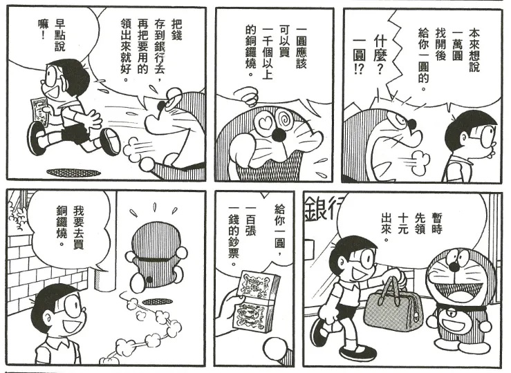 在单行本第32卷中,有一则名为《大富豪大雄》的短篇故事,在这个故事中,大雄偶然找到了自己曾认为丢失的一万日元压岁钱,放到现在,相当于1000多人民币,这个数对于一个普通小学生来说,也算是一笔“巨款”了。大雄让哆啦A梦用“假如电话亭”把物价降的很低,而自己的一万日元不变,摇身一边成了大富豪。而变成了大富豪的大雄也引来了很多企业的巴结。