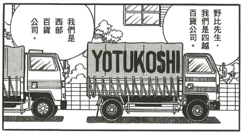 四越百货公司,原型即为“三越百货公司”。三越百货公司是日本第一家百货公司,隶属于日本三大财团之一的三井财团,“三越”中的三字,便是来自于“三井”中的三字,其位于日本桥的总店大楼如今已经成为日本重要文化财产。三越百货公司在这篇故事连载的1981年,正是处于高速扩张的鼎盛时期,但是就在第二年的1982年,爆出了震惊日本商界“三越丑闻”,经营状况开始出现滑坡。2011年改组,成为现在的三越伊势丹控股下的百货公司。