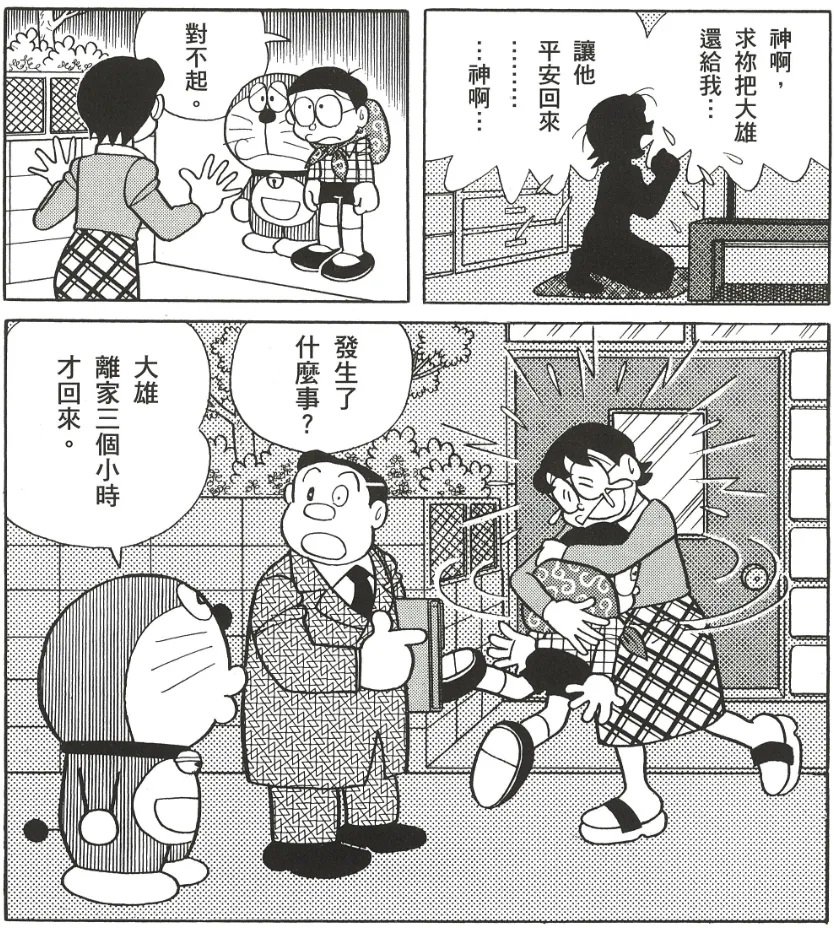 再之后就是单行本第2卷的名篇《我出生的那一天》中,夫妻二人迎来了大雄的出生,在画面中,我们也可以看到大雄妈妈的脸上洋溢幸福的笑容。