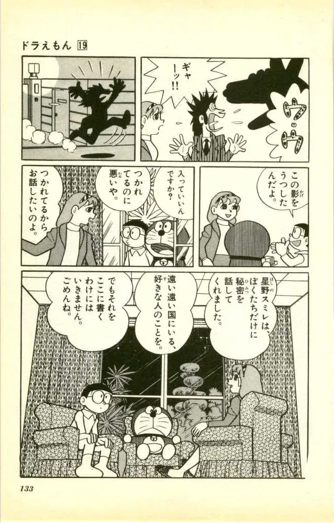 到了收录于单行本第19卷的短篇《剪影放映机》里,我们从小夫的对话中,得知星野堇的恋人是个迷,而当哆拉A梦和大雄为星野堇解围之后,星野堇和他们对话中便提到了关于遥远的地方,和她的恋人。