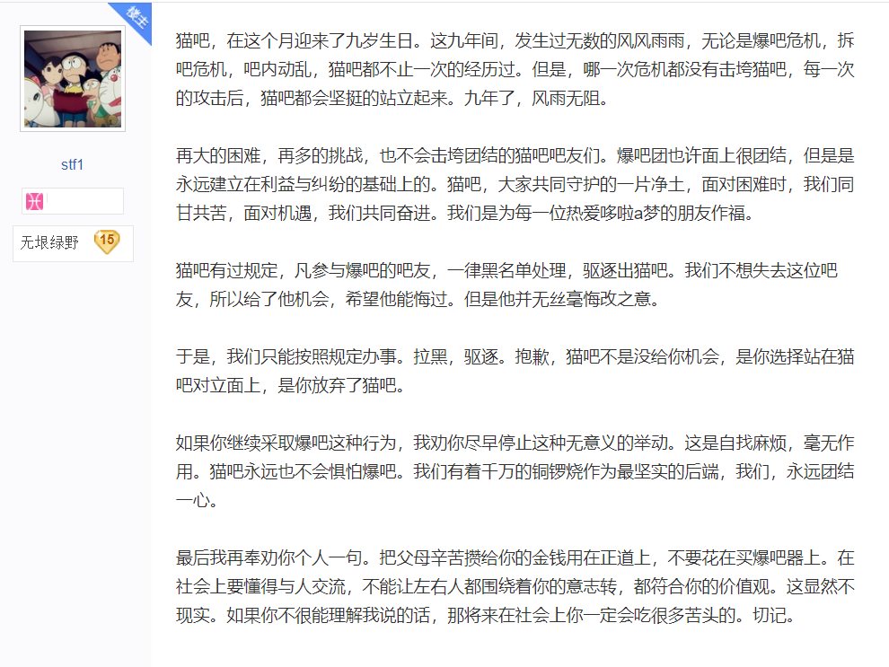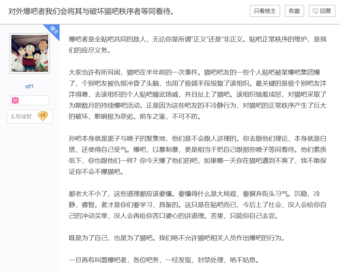 - ^ stf1《对外爆吧者我们会将其与破坏猫吧秩序者等同看待。》