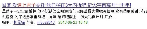 相思菁灵发布有关被爆吧的通告[31],宇宙也出面亲自规劝冲动的吧友 [32]。