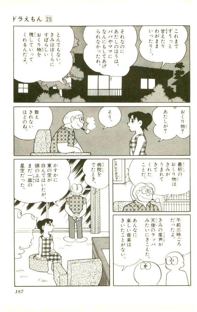 静香爸爸在漫画中出场次数并不多,最让人印象深刻的就是单行本第25卷《大雄的结婚前夜》中,静香爸爸对于即将出嫁的静香的那番寄语。从这番对话中,可以深刻体会到一个父亲面对即将出嫁的女儿的那种不舍,也包含了对女儿未来生活的祝福。藤子·F·不二雄老师自己就有三个女儿,想必他在创作这个情节的时候,也一定是包含了自己对于女儿的爱。