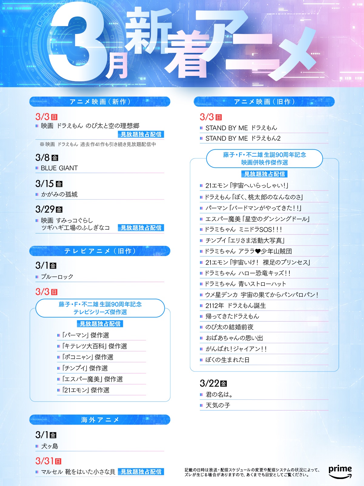 ・机器猫吧电影《哆啦A梦:大雄与天空的理想乡》今日上线日本Amazon Prime Video!此外,还将上线“藤子・F・不二雄 诞辰90周年纪念 附篇电影杰作选”及“藤子・F・不二雄 诞辰90周年纪念 TV剧集杰作选”系列,Prime会员可无限次回顾哆啦A梦剧场版电影系列以及F角色们的经典名作!